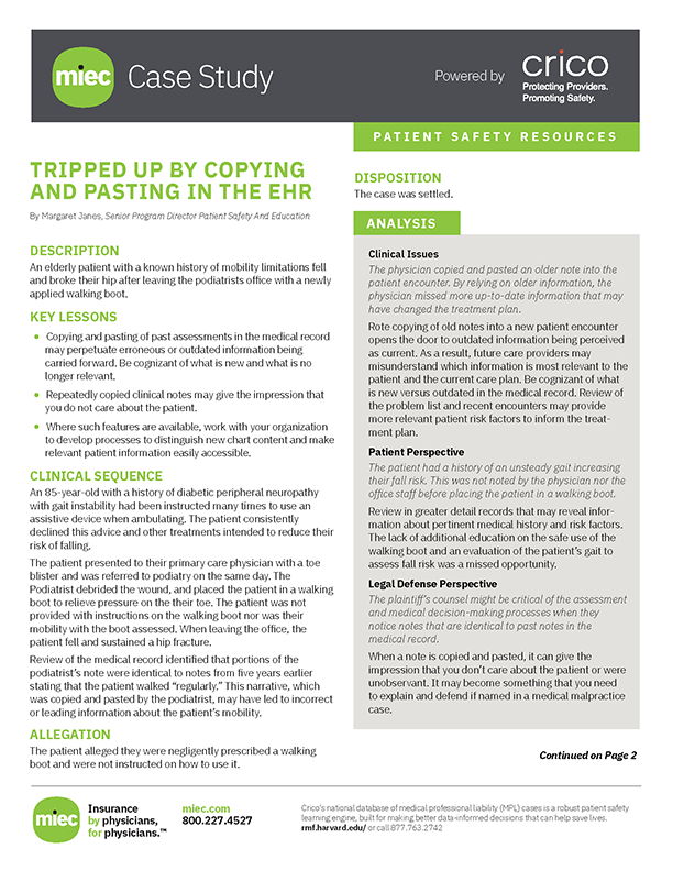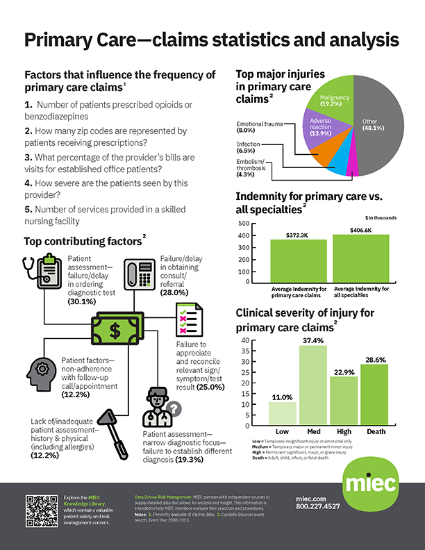 MIEC, in partnership with CRICO/Candello, provides a catalog of case studies as learning opportunities across a wide variety of specialties and circumstances to help policyholders build awareness and risk mitigation strategies. MIEC also offers specialty-specific information sheets that draw on claims data from Candello, Preverity, and other sources to show the drivers of risk in different medical specialties. Included are examples of real malpractice cases, and strategies for maximizing patient safety and reducing liability through targeted risk management interventions.