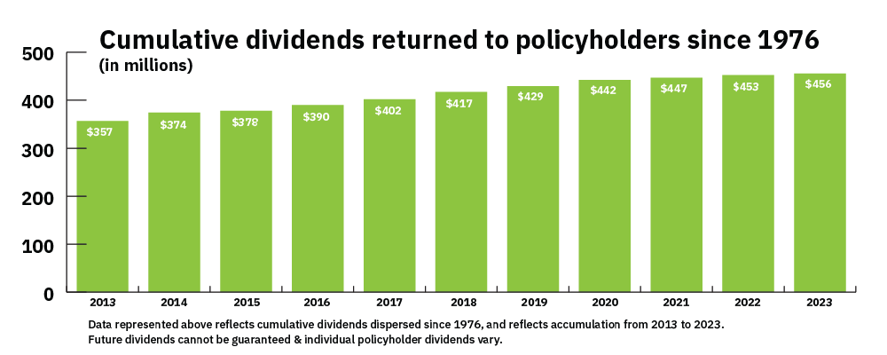 Because we have no external shareholders or owners, we return the proceeds from better-than-expected operating results to our policyholders in the form of dividend credits. Since starting dividend distributions we have declared almost $456 million in dividend credits to our policyholders. Dividends vary yearly and cannot be guaranteed.